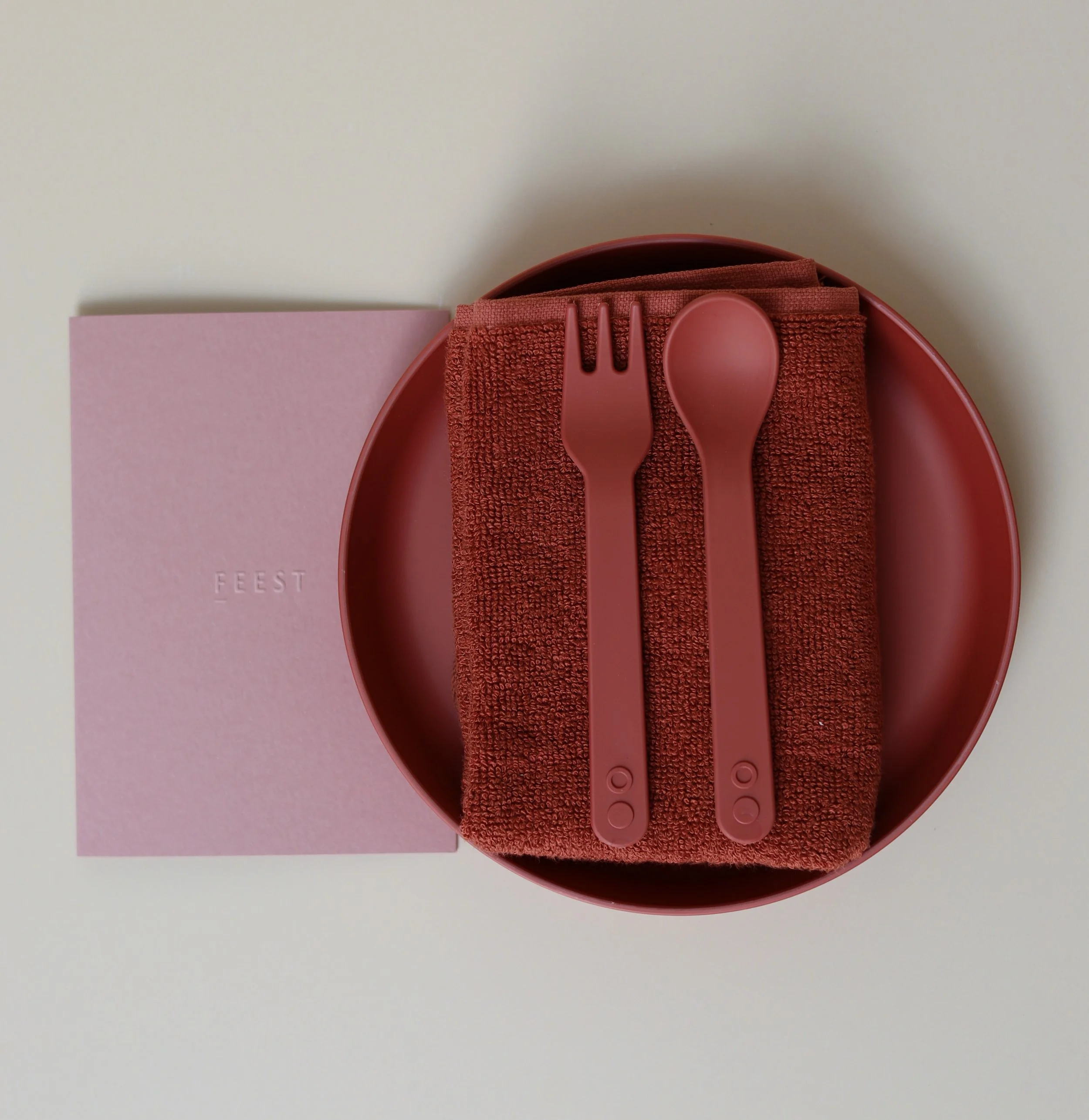 Het bord heeft een hoge rand om het scheppen gemakkelijker te maken voor kinderen die zelf leren eten. Bestek en bord zijn vaatwasmachinebestendig; het bord kan gebruikt worden om eten op te warmen in de magnetron. De beker, lepel en vork zijn perfect afgestemd op kleine kinderhandjes. De reeks is gemaakt van plantaardig plastic. Dit materiaal wordt PLA genoemd, wat staat voor PolyLactic Acid. Het is gemaakt van hernieuwbare, biologische hulpbronnen (zoals maïs, suikerriet, landbouwafval, enz.) in plaats van aardolie.